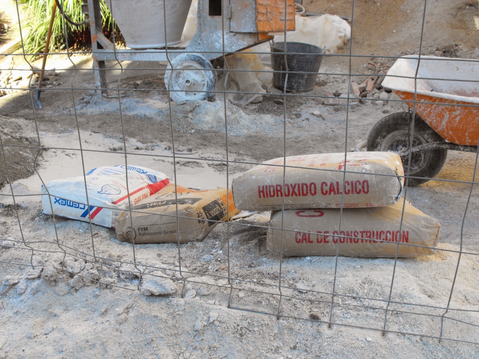 Llama la atención la preparación del mortero para estas tareas. Se puede observar una montaña de dos tipos de arena o árido mezclada de forma no homogénea, sin conseguir uniformidad, sacos de cemento portland, cemento blanco y cal en polvo.